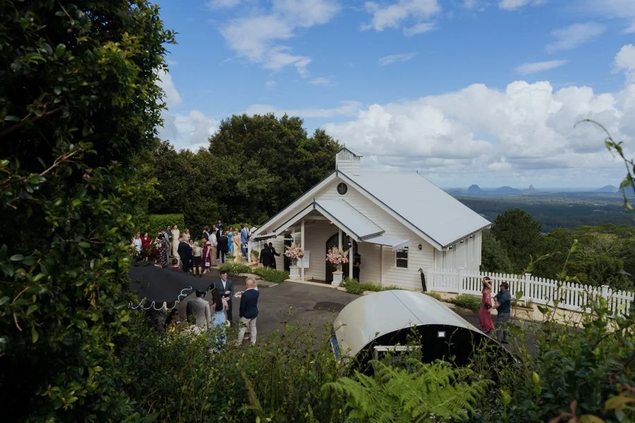 The day kicked off with a light drizzle — the kind that makes you question your life choices while sprinting from the car in silk pyjamas. But as luck would have it, by the time we settled into getting ready at Maleny Lodge, the clouds parted, the sun came out, and the skies turned that dreamy blue every photographer prays for.