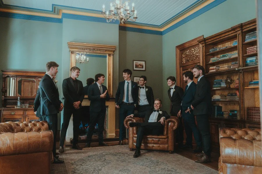 The day began with the boys getting ready in Gabbinbar’s iconic Library Room – full of rich textures, mood lighting, and that classic “groom’s morning” vibe. Cooper and his groomsmen were full of energy and fun, making for a relaxed and candid pre-ceremony session. We also stepped outside for a few natural light portraits and some fun shots – the groom nailed it.